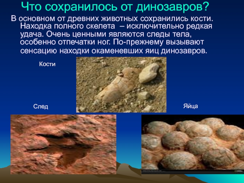 кости. Находка полного скелета – исключительно редкая удача. Очень ценными являются следы тела, особенно отпечатки ног. По-прежнему вызывают сенсацию находки окаменевших яиц динозавров.