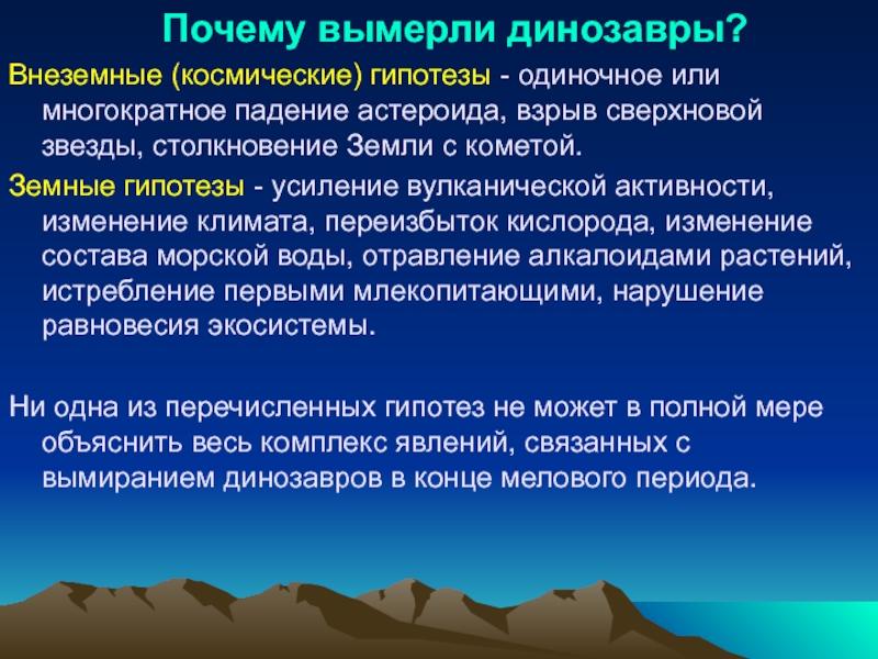 Земные гипотезы - усиление вулканической активности, изменение климата, переизбыток кислорода, изменение состава морской воды, отравление алкалоидами растений, истребление первыми млекопитающими, нарушение равновесия экосистемы.