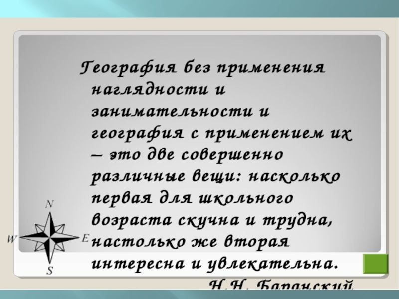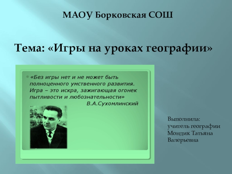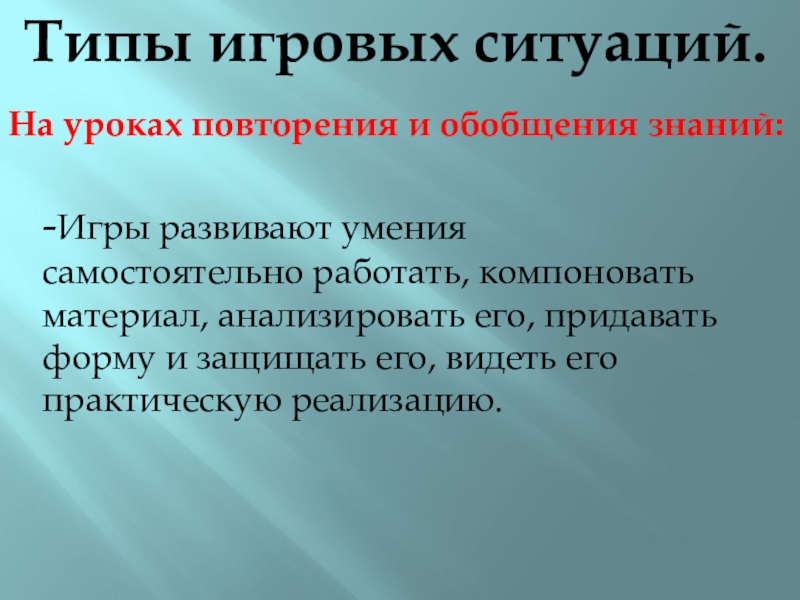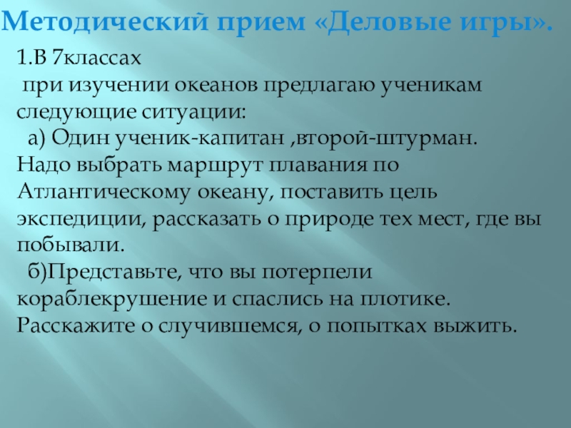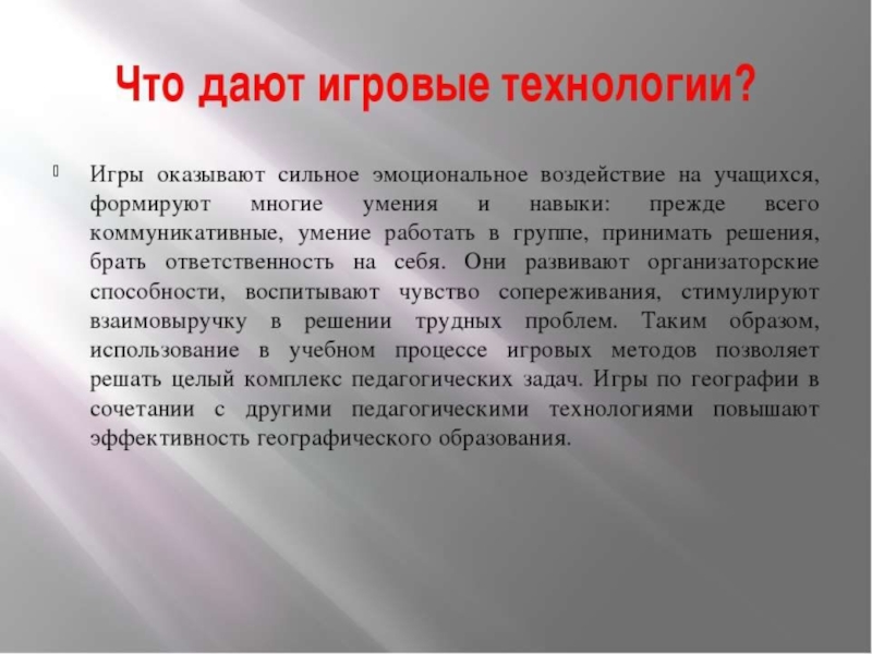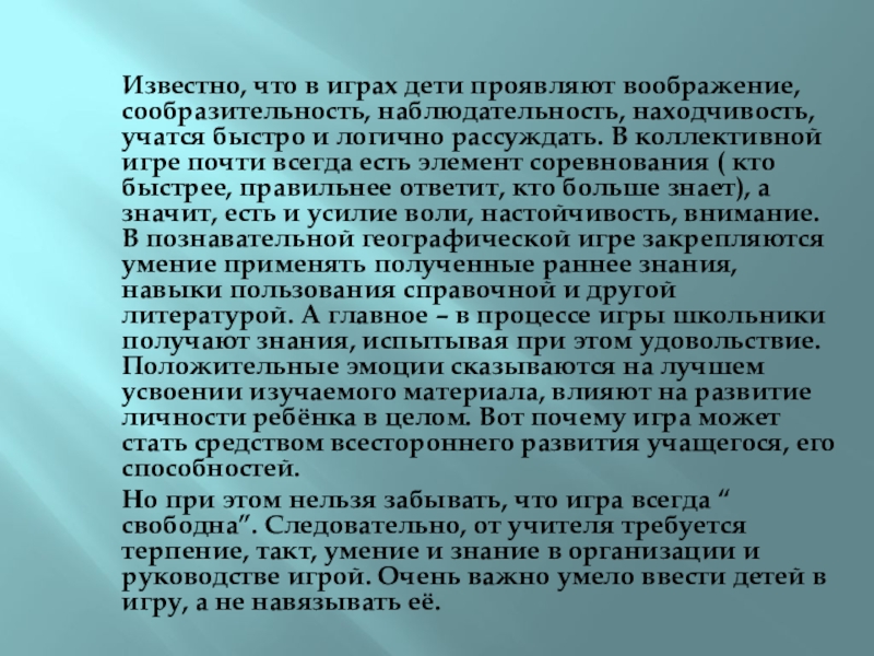 быстро и логично рассуждать. В коллективной игре почти всегда есть элемент соревнования ( кто быстрее, правильнее ответит, кто больше знает), а значит, есть и усилие воли, настойчивость, внимание. В познавательной географической игре закрепляются умение применять полученные раннее знания, навыки пользования справочной и другой литературой. А главное – в процессе игры школьники получают знания, испытывая при этом удовольствие. Положительные эмоции сказываются на лучшем усвоении изучаемого материала, влияют на развитие личности ребёнка в целом. Вот почему игра может стать средством всестороннего развития учащегося, его способностей.