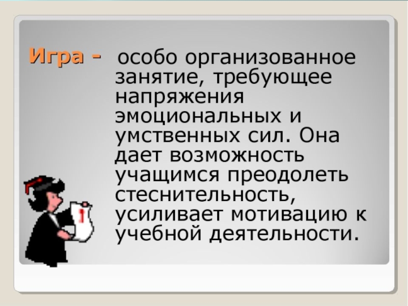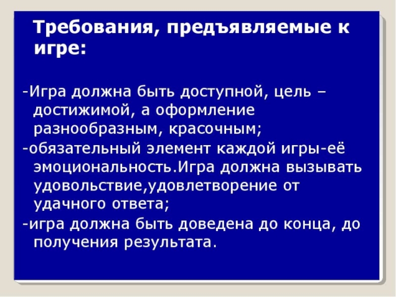 Но при этом нельзя забывать, что игра всегда “ свободна”. Следовательно, от учителя требуется терпение, такт, умение и знание в организации и руководстве игрой. Очень важно умело ввести детей в игру, а не навязывать её.
