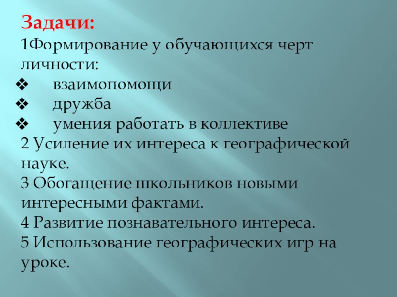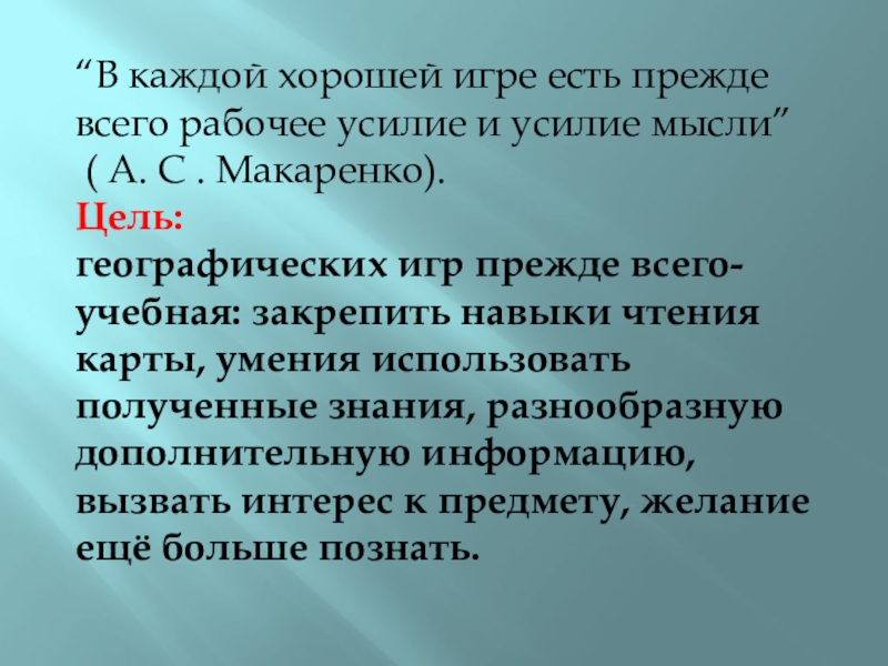 географических игр прежде всего- учебная: закрепить навыки чтения карты, умения использовать полученные знания, разнообразную дополнительную информацию, вызвать интерес к предмету, желание ещё больше познать.
