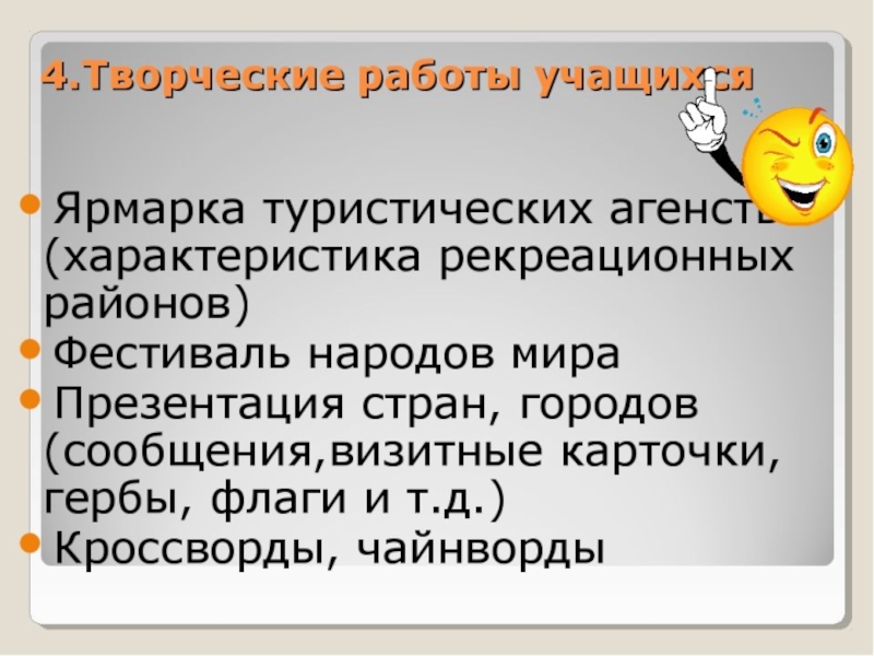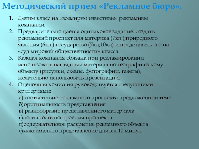 одинаковое задание: создать рекламный проспект для материка (7кл.);природного явления (6кл.),государство (7кл;10кл) и представить его на «суд мировой общественности» класса.
