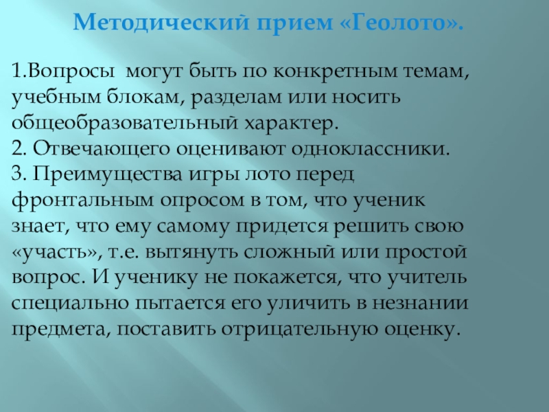 3. Преимущества игры лото перед фронтальным опросом в том, что ученик знает, что ему самому придется решить свою «участь», т.е. вытянуть сложный или простой вопрос. И ученику не покажется, что учитель специально пытается его уличить в незнании предмета, поставить отрицательную оценку.