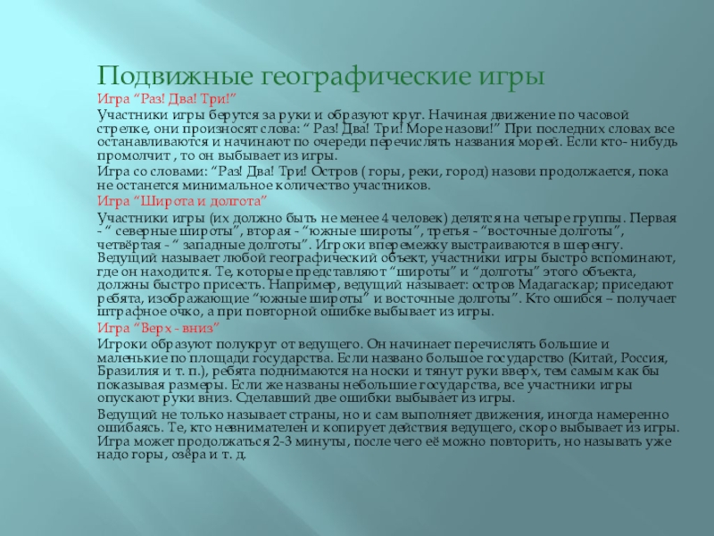 образуют круг. Начиная движение по часовой стрелке, они произносят слова: “ Раз! Два! Три! Море назови!” При последних словах все останавливаются и начинают по очереди перечислять названия морей. Если кто- нибудь промолчит , то он выбывает из игры.