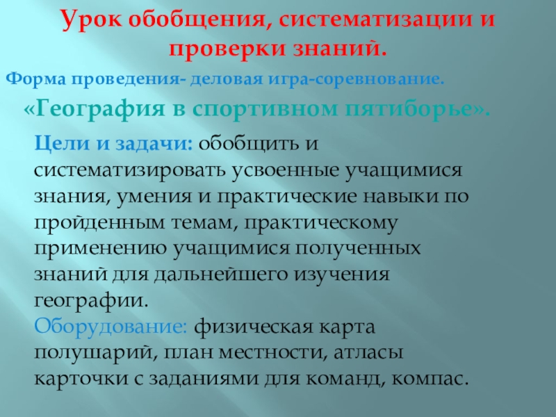 Цели и задачи: обобщить и систематизировать усвоенные учащимися знания, умения и практические навыки по пройденным темам, практическому применению учащимися полученных знаний для дальнейшего изучения географии.