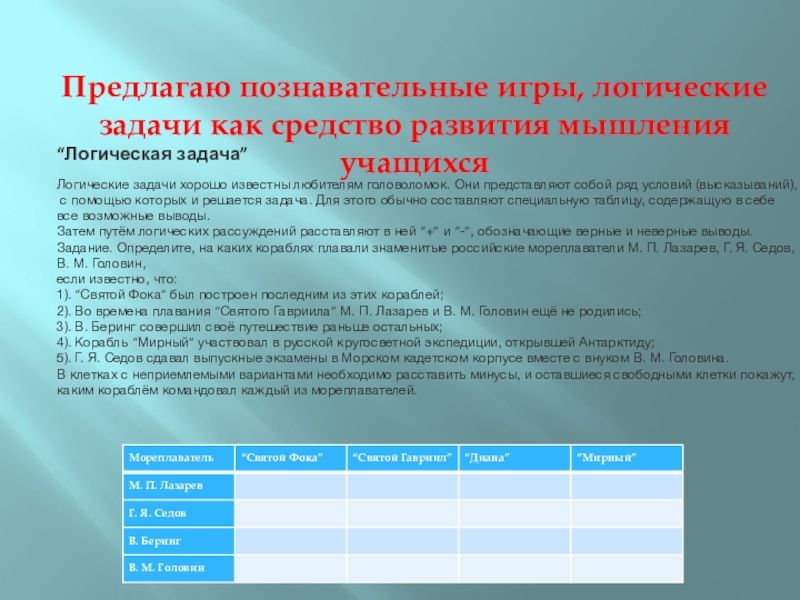 Слайд 20Предлагаю познавательные игры, логические задачи как средство развития мышления учащихся