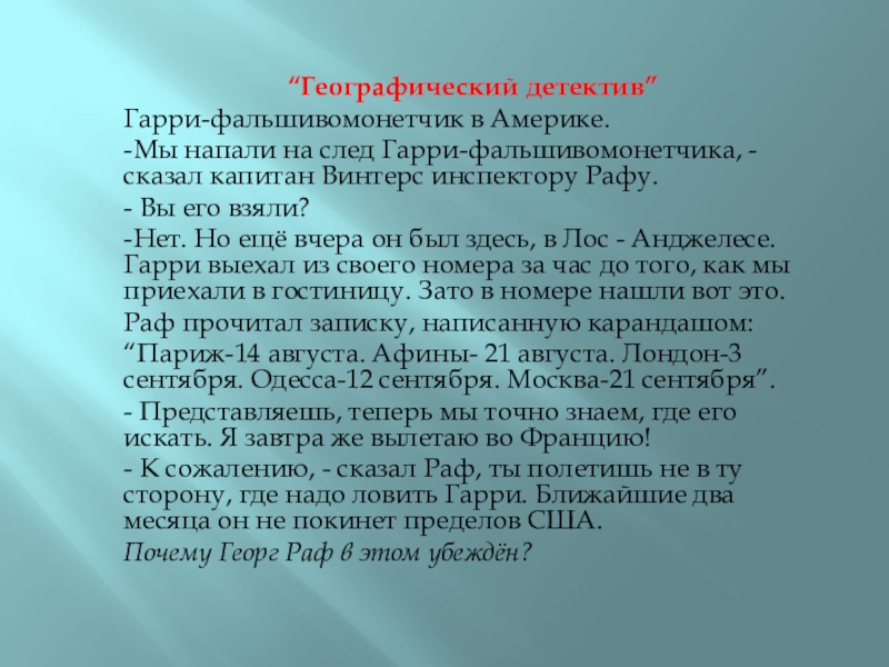 - К сожалению, - сказал Раф, ты полетишь не в ту сторону, где надо ловить Гарри. Ближайшие два месяца он не покинет пределов США.