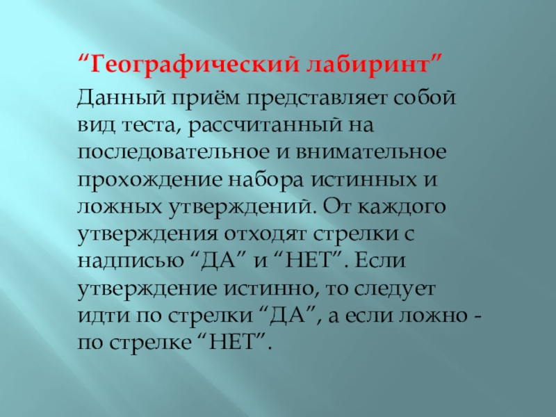 внимательное прохождение набора истинных и ложных утверждений. От каждого утверждения отходят стрелки с надписью “ДА” и “НЕТ”. Если утверждение истинно, то следует идти по стрелки “ДА”, а если ложно - по стрелке “НЕТ”.