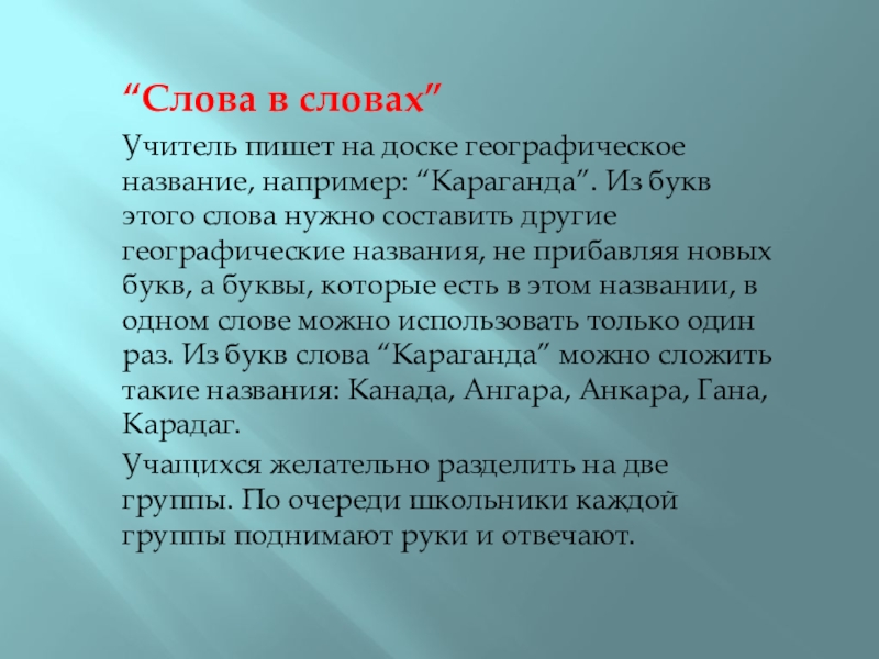 Учитель пишет на доске географическое название, например: “Караганда”. Из