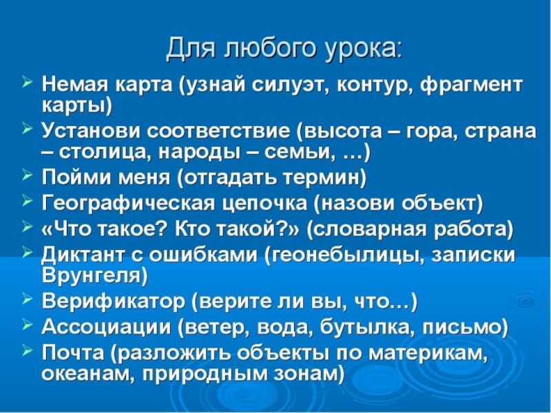 Учащимся даётся задание по определённым материкам, островам, морям и. т.