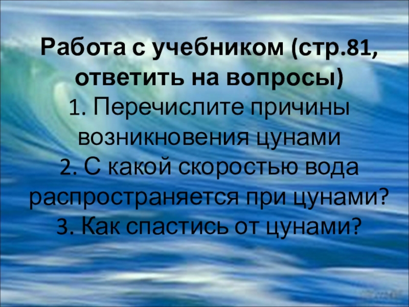 Слайд 7Работа с учебником (стр.81, ответить на вопросы) 1. Перечислите причины возникновения цунами 2.
