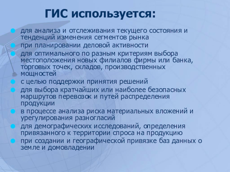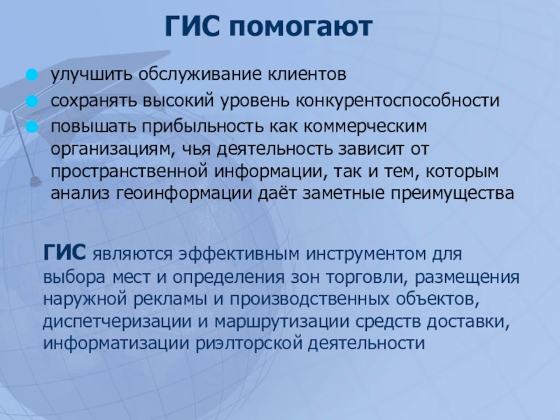 повышать прибыльность как коммерческим организациям, чья деятельность зависит от пространственной информации, так и тем, которым анализ геоинформации даёт заметные преимущества