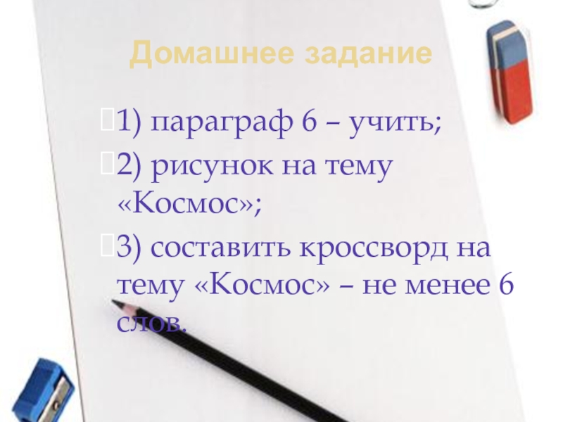 Домашнее задание1) параграф 6 – учить;2) рисунок на тему «Космос»;3) составить кроссворд на тему «Космос» – не