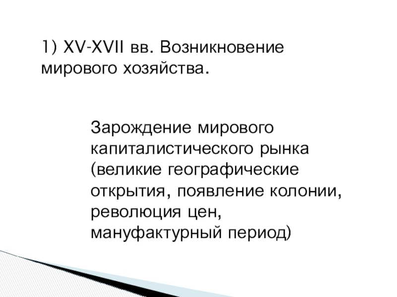 1) XV-XVII вв. Возникновение мирового хозяйства. Зарождение мирового капиталистического рынка (великие географические открытия, появление колонии, революция цен,