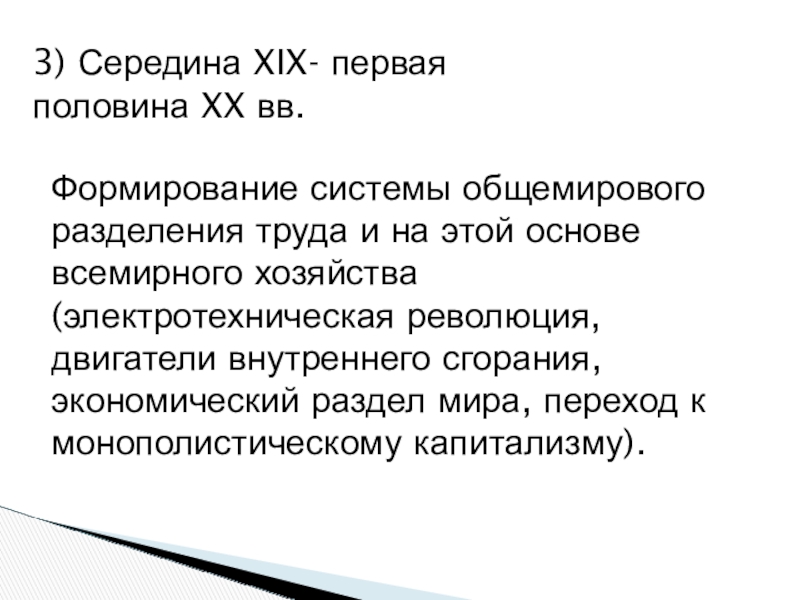 3) Середина XIX- первая половина XX вв.Формирование системы общемирового разделения труда и на этой основе всемирного хозяйства