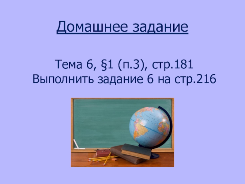 Домашнее заданиеТема 6, §1 (п.3), стр.181Выполнить задание 6 на стр.216