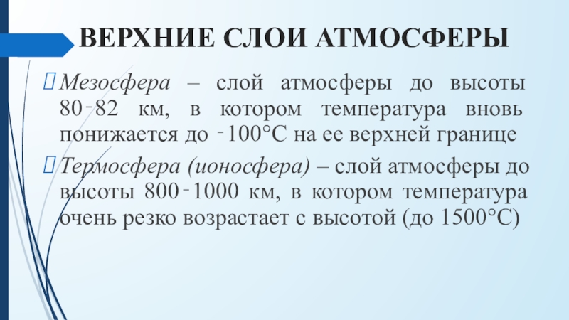 Приземный слой – самый нижний тонкий слой тропосферы (50‐100 м), примыкающий к земной поверхности и испытывающий ее наибольшее влияние