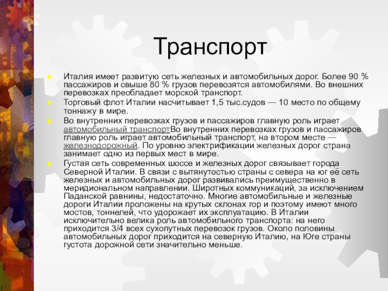 Италия имеет развитую сеть железных и автомобильных дорог. Более 90 %