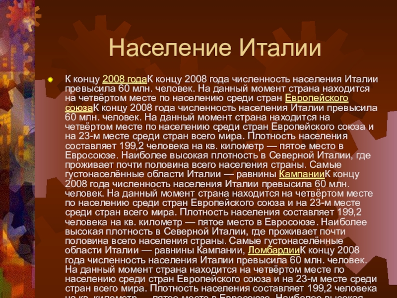 превысила 60 млн. человек. На данный момент страна находится на четвёртом месте по населению среди стран Европейского союзаК концу 2008 года численность населения Италии превысила 60 млн. человек. На данный момент страна находится на четвёртом месте по населению среди стран Европейского союза и на 23-м месте среди стран всего мира. Плотность населения составляет 199,2 человека на кв. километр — пятое место в Евросоюзе. Наиболее высокая плотность в Северной Италии, где проживает почти половина всего населения страны. Самые густонаселённые области Италии — равнины КампанииК концу 2008 года численность населения Италии превысила 60 млн. человек. На данный момент страна находится на четвёртом месте по населению среди стран Европейского союза и на 23-м месте среди стран всего мира. Плотность населения составляет 199,2 человека на кв. километр — пятое место в Евросоюзе. Наиболее высокая плотность в Северной Италии, где проживает почти половина всего населения страны. Самые густонаселённые области Италии — равнины Кампании, ЛомбардииК концу 2008 года численность населения Италии превысила 60 млн. человек. На данный момент страна находится на четвёртом месте по населению среди стран Европейского союза и на 23-м месте среди стран всего мира. Плотность населения составляет 199,2 человека на кв. километр — пятое место в Евросоюзе. Наиболее высокая плотность в Северной Италии, где проживает почти половина всего населения страны. Самые густонаселённые области Италии — равнины Кампании, Ломбардии и Лигурии, где на один кв. км приходится свыше 300 жителей. Это объясняется благоприятными условиями для развития здесь интенсивного земледелия, разнообразной промышленности, портовой деятельности и туризма. Особенной скученностью населения отличается провинция Неаполь в Кампании, где на 1 км². сконцентрировано 2531 человек. Горные же районы населены гораздо реже. Здесь плотность населения падает до 35 человек на 1 км²., в засушливых и экономически слаборазвитых областях Сардинии и Базиликате плотность населения — 60 человек на 1 км².