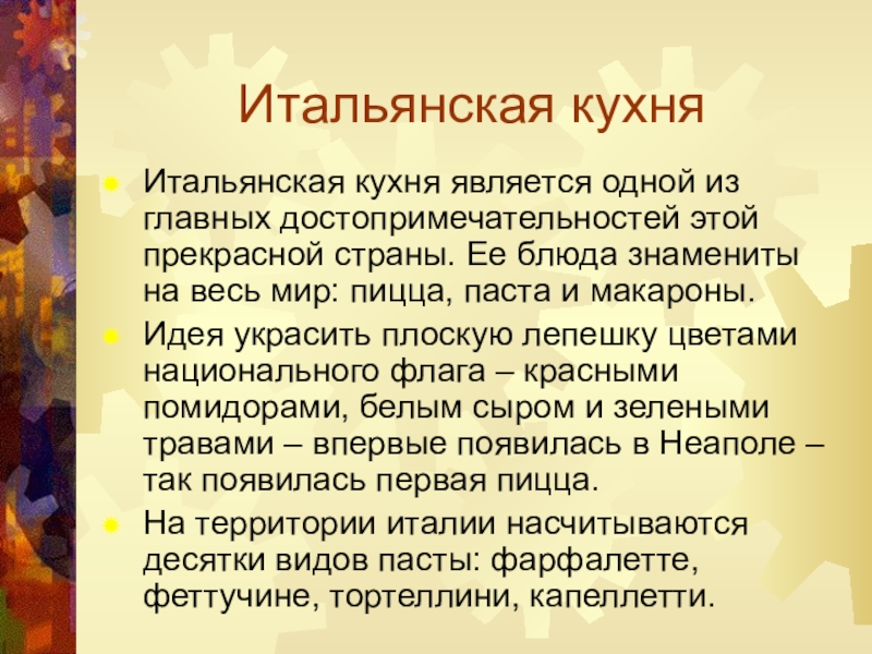 Слайд 15Итальянская кухня