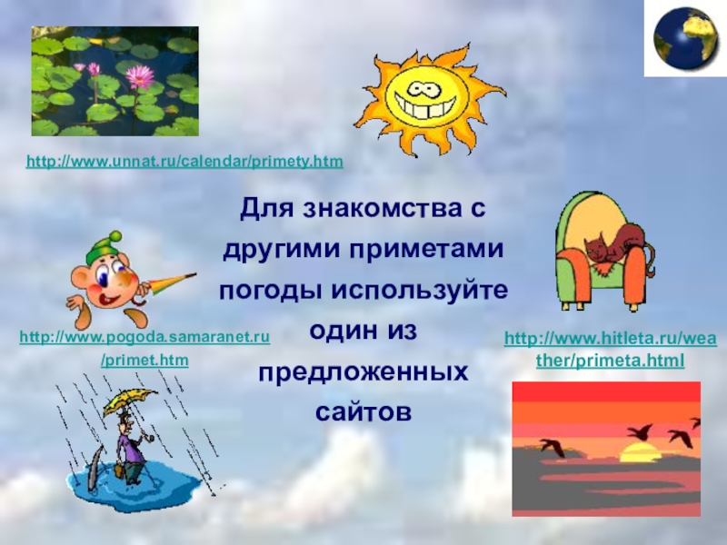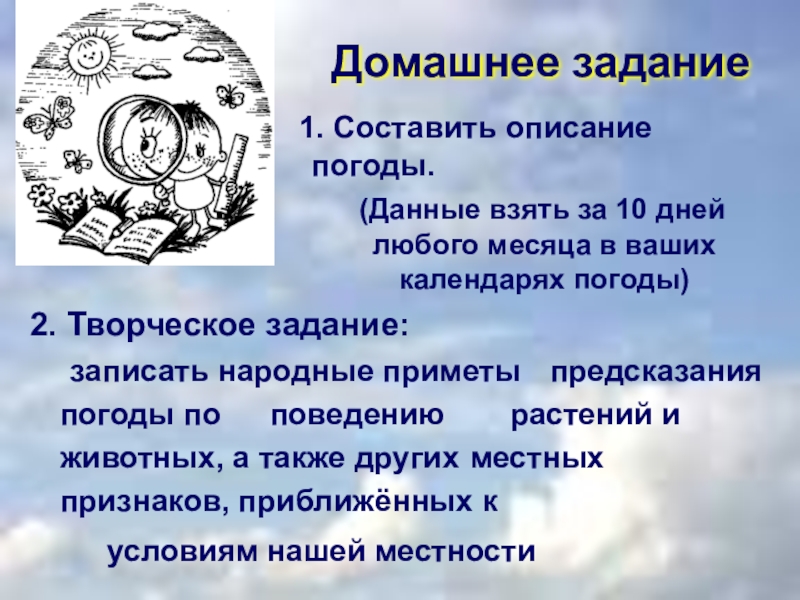 записать народные приметы предсказания погоды по поведению растений и животных, а также других местных признаков, приближённых к