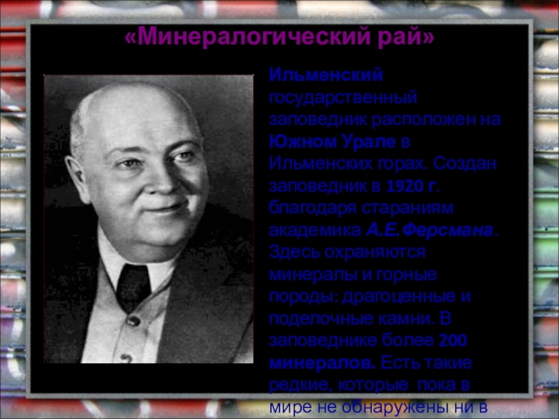 в Ильменских горах. Создан заповедник в 1920 г. благодаря стараниям академика А.Е.Ферсмана. Здесь охраняются минералы и горные породы: драгоценные и поделочные камни. В заповеднике более 200 минералов. Есть такие редкие, которые пока в мире не обнаружены ни в одних горах.