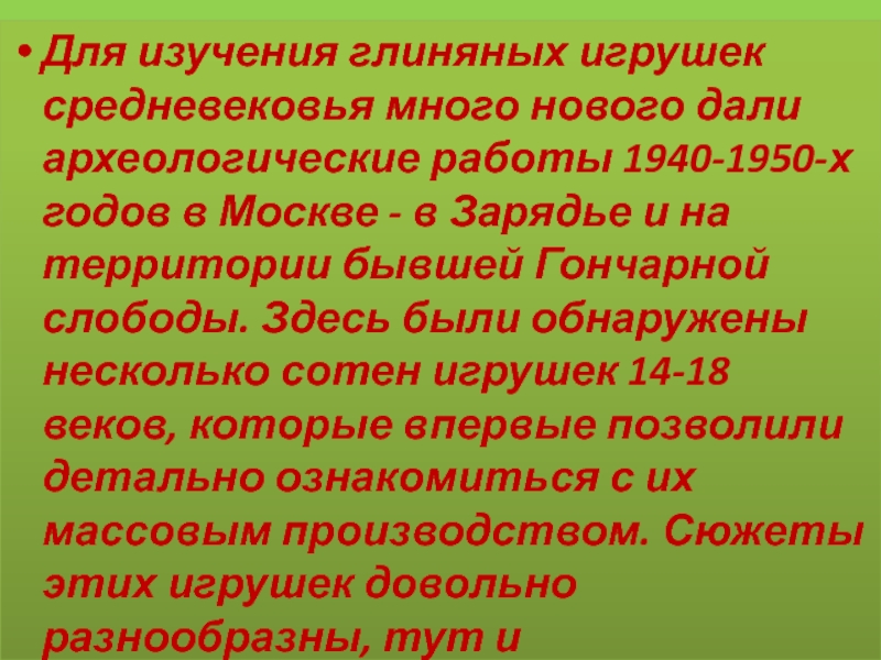годов в Москве - в Зарядье и на территории бывшей Гончарной слободы. Здесь были обнаружены несколько сотен игрушек 14-18 веков, которые впервые позволили детально ознакомиться с их массовым производством. Сюжеты этих игрушек довольно разнообразны, тут и традиционные кони, птицы-свистульки, бараны.