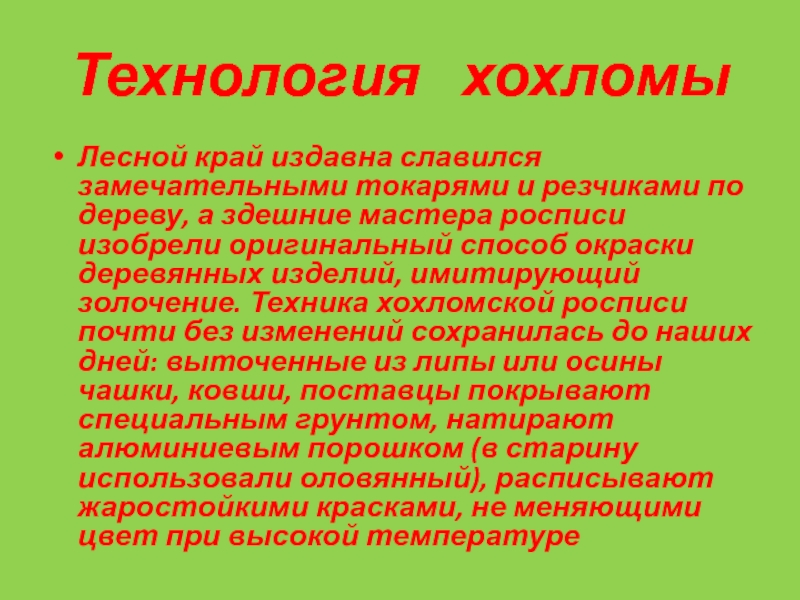 дереву, а здешние мастера росписи изобрели оригинальный способ окраски деревянных изделий, имитирующий золочение. Техника хохломской росписи почти без изменений сохранилась до наших дней: выточенные из липы или осины чашки, ковши, поставцы покрывают специальным грунтом, натирают алюминиевым порошком (в старину использовали оловянный), расписывают жаростойкими красками, не меняющими цвет при высокой температуре