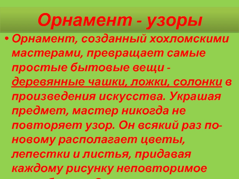 - деревянные чашки, ложки, солонки в произведения искусства. Украшая предмет, мастер никогда не повторяет узор. Он всякий раз по-новому располагает цветы, лепестки и листья, придавая каждому рисунку неповторимое своеобразие. Эти узоры кажется "поют".