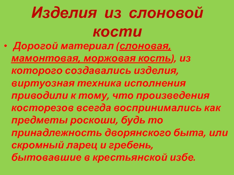 создавались изделия, виртуозная техника исполнения приводили к тому, что произведения косторезов всегда воспринимались как предметы роскоши, будь то принадлежность дворянского быта, или скромный ларец и гребень, бытовавшие в крестьянской избе.