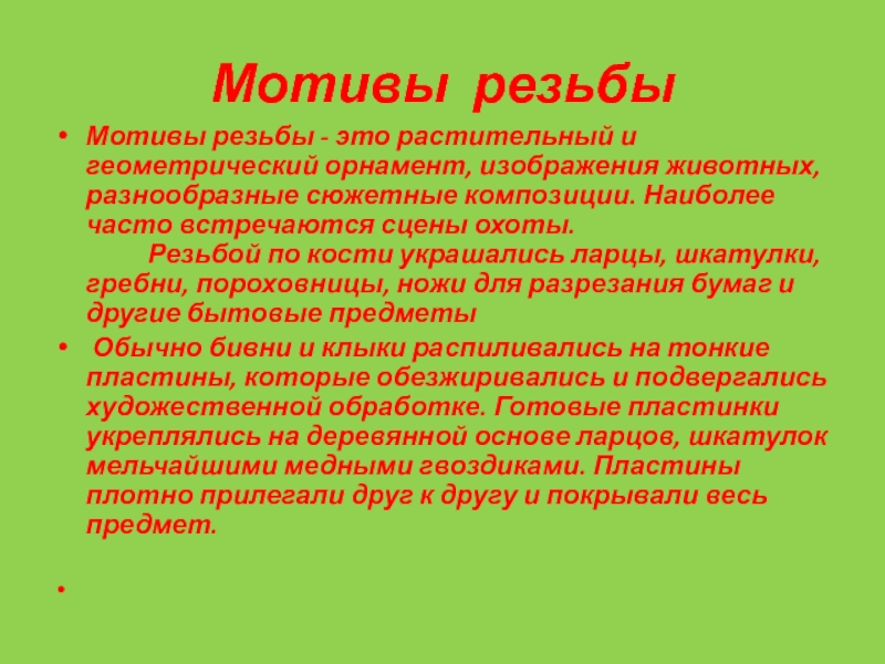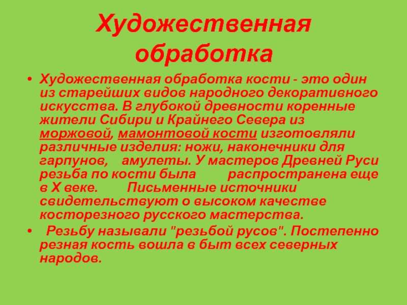 декоративного искусства. В глубокой древности коренные жители Сибири и Крайнего Севера из моржовой, мамонтовой кости изготовляли различные изделия: ножи, наконечники для гарпунов, амулеты. У мастеров Древней Руси резьба по кости была распространена еще в Х веке. Письменные источники свидетельствуют о высоком качестве косторезного русского мастерства.