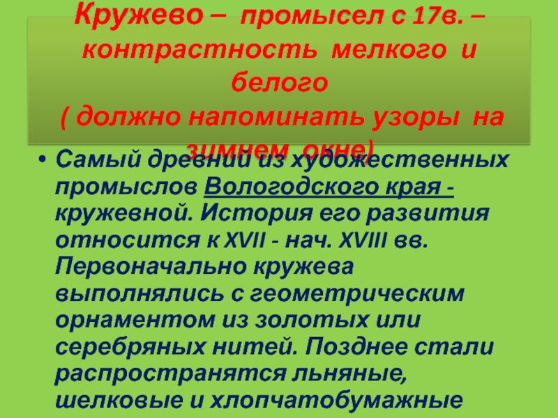 Слайд 63Кружево – промысел с 17в. – контрастность мелкого и белого