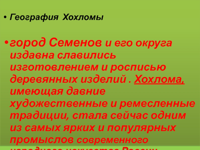 деревянных изделий . Хохлома, имеющая давние художественные и ремесленные традиции, стала сейчас одним из самых ярких и популярных промыслов современного народного искусства России