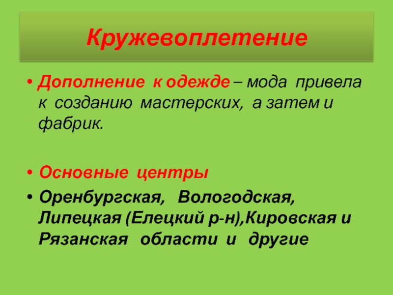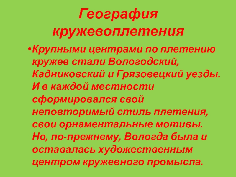 Крупными центрами по плетению кружев стали Вологодский, Кадниковский и Грязовецкий