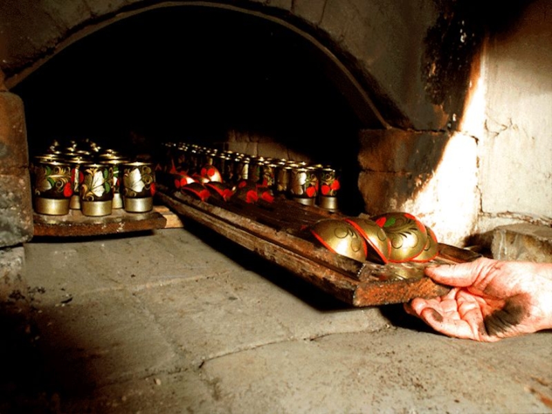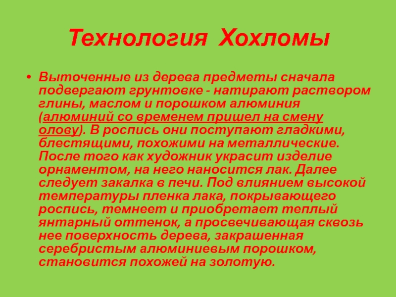 глины, маслом и порошком алюминия (алюминий со временем пришел на смену олову). В роспись они поступают гладкими, блестящими, похожими на металлические. После того как художник украсит изделие орнаментом, на него наносится лак. Далее следует закалка в печи. Под влиянием высокой температуры пленка лака, покрывающего роспись, темнеет и приобретает теплый янтарный оттенок, а просвечивающая сквозь нее поверхность дерева, закрашенная серебристым алюминиевым порошком, становится похожей на золотую.