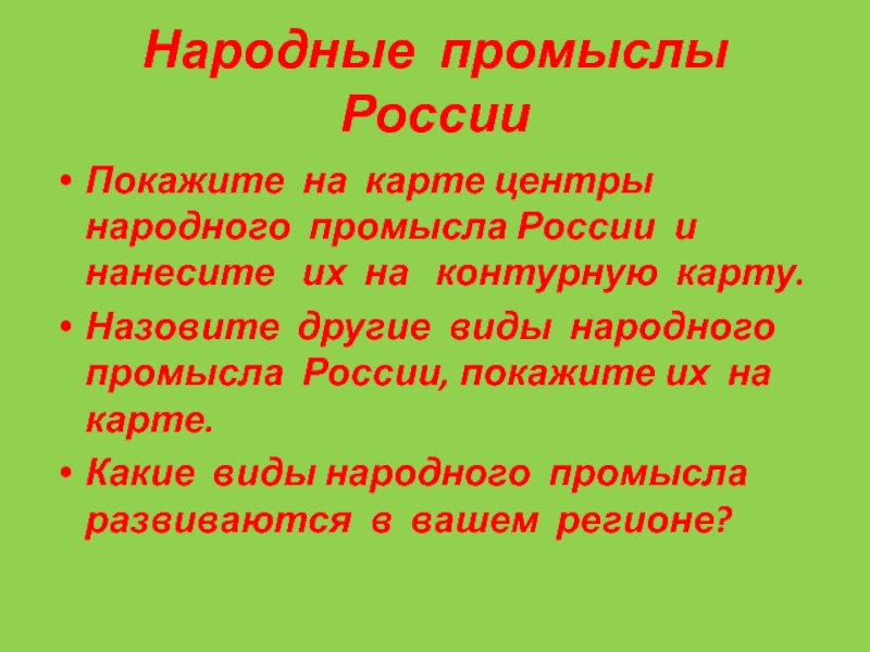 Назовите другие виды народного промысла России, покажите их на карте.