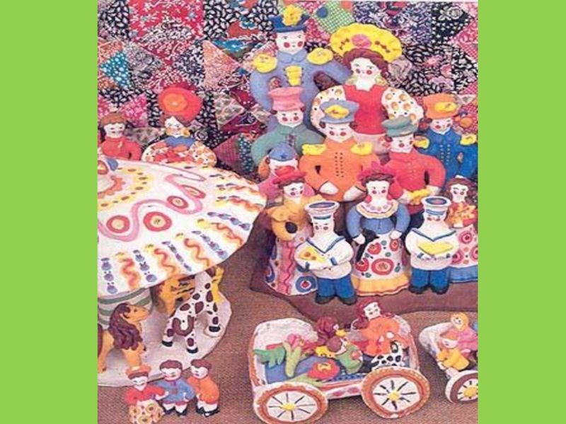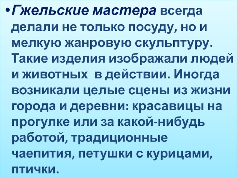 Слайд 40Гжельские мастера всегда делали не только посуду, но и мелкую жанровую