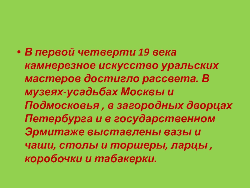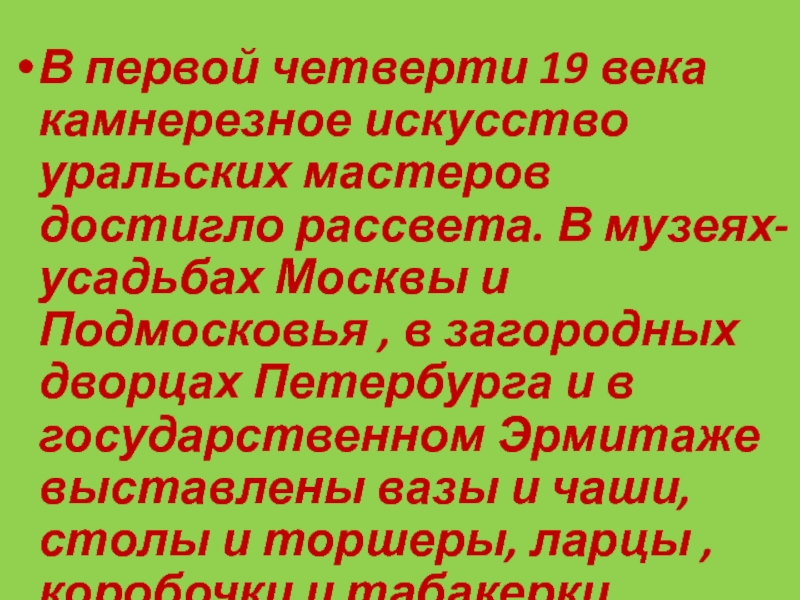 Слайд 85В первой четверти 19 века камнерезное искусство уральских мастеров достигло рассвета.