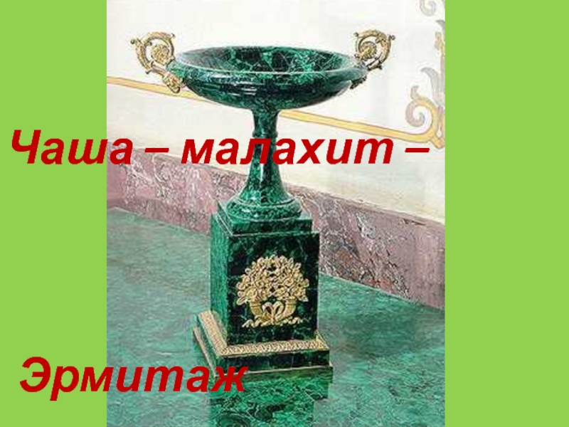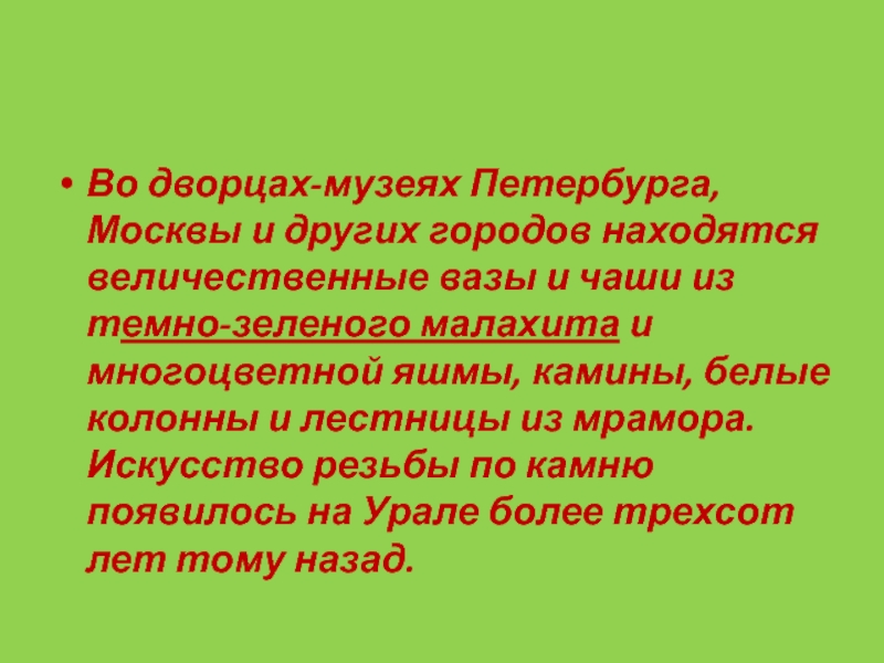чаши из темно-зеленого малахита и многоцветной яшмы, камины, белые колонны и лестницы из мрамора. Искусство резьбы по камню появилось на Урале более трехсот лет тому назад.
