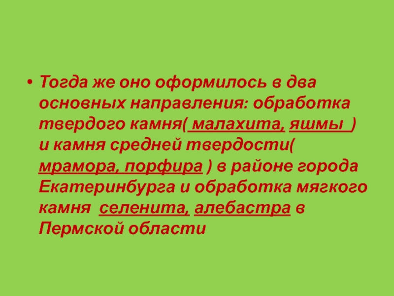 малахита, яшмы ) и камня средней твердости( мрамора, порфира ) в районе города Екатеринбурга и обработка мягкого камня селенита, алебастра в Пермской области