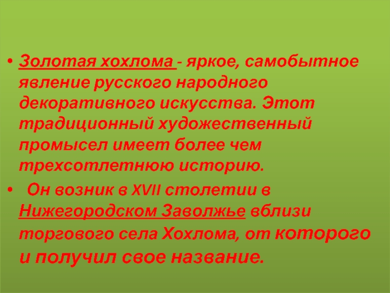 Он возник в XVII столетии в Нижегородском Заволжье вблизи торгового села Хохлома, от которого и получил свое название.