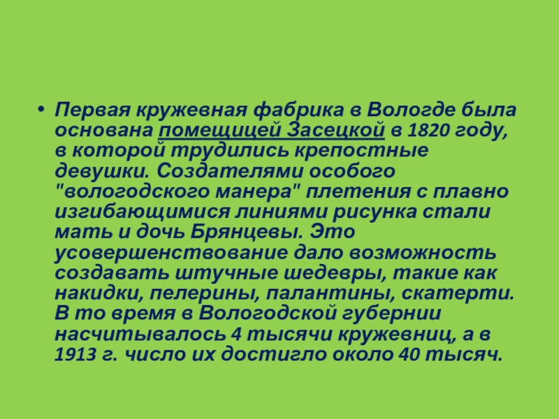 Слайд 64Первая кружевная фабрика в Вологде была основана помещицей Засецкой в 1820