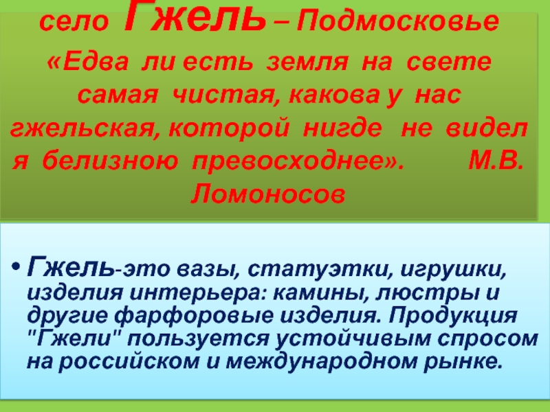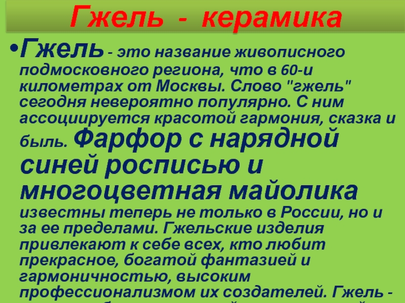 60-и километрах от Москвы. Слово "гжель" сегодня невероятно популярно. С ним ассоциируется красотой гармония, сказка и быль. Фарфор с нарядной синей росписью и многоцветная майолика известны теперь не только в России, но и за ее пределами. Гжельские изделия привлекают к себе всех, кто любит прекрасное, богатой фантазией и гармоничностью, высоким профессионализмом их создателей. Гжель -это колыбель и основной центр русской керамики
