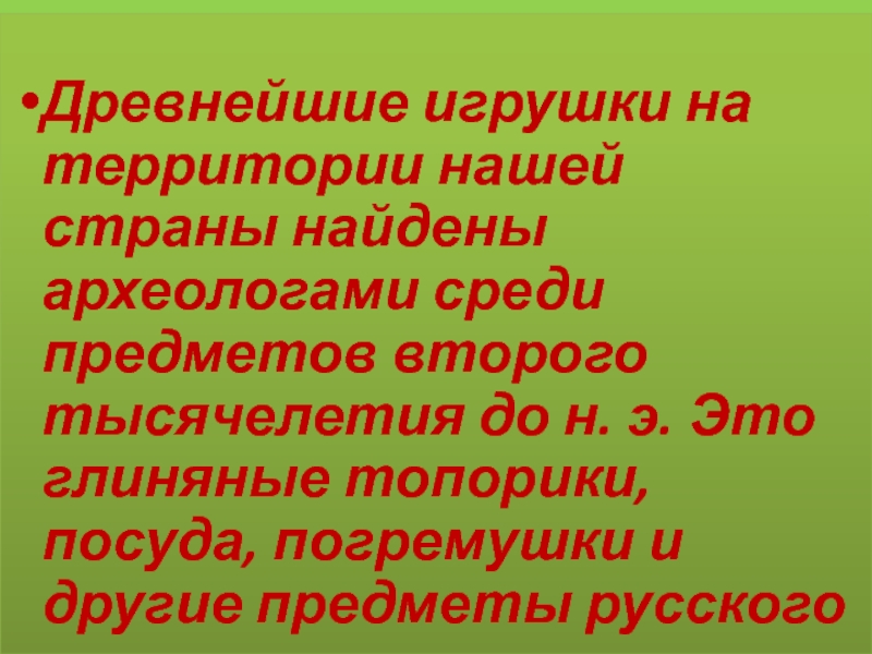 Древнейшие игрушки на территории нашей страны найдены археологами среди предметов второго