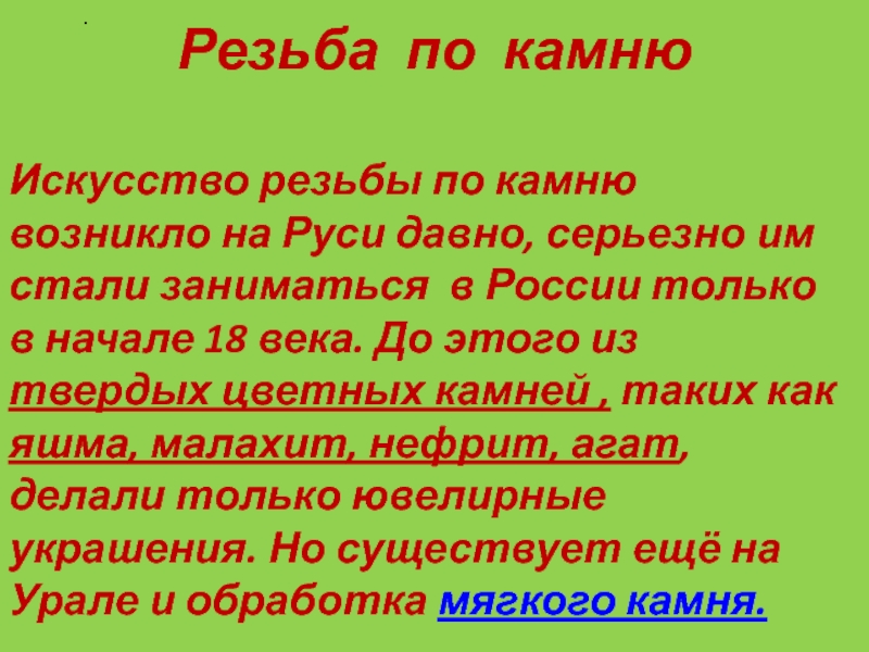 им стали заниматься в России только в начале 18 века. До этого из твердых цветных камней , таких как яшма, малахит, нефрит, агат, делали только ювелирные украшения. Но существует ещё на Урале и обработка мягкого камня.