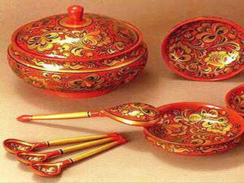 Хохломские изделия, сверкающие золотом и великолепием лаков, радующие красочной,