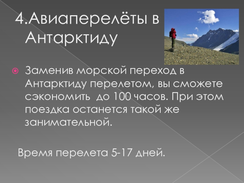 4.Авиаперелёты в АнтарктидуЗаменив морской переход в Антарктиду перелетом, вы сможете сэкономить до 100 часов. При этом поездка