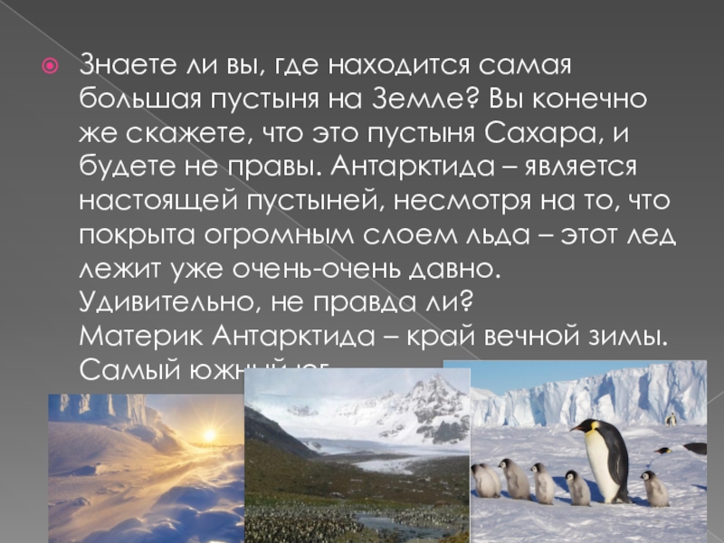 конечно же скажете, что это пустыня Сахара, и будете не правы. Антарктида – является настоящей пустыней, несмотря на то, что покрыта огромным слоем льда – этот лед лежит уже очень-очень давно. Удивительно, не правда ли? Материк Антарктида – край вечной зимы. Самый южный юг.