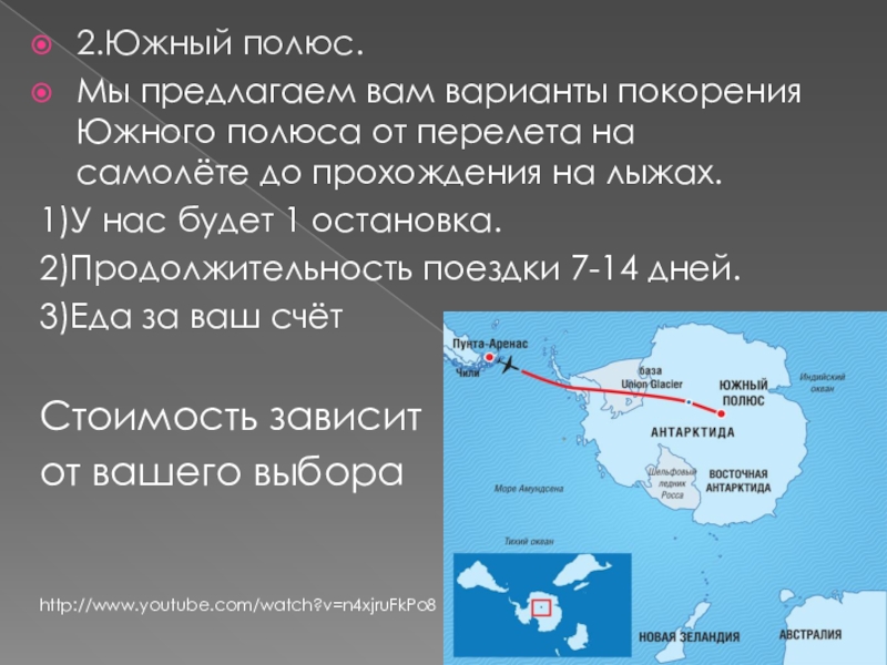 2.Южный полюс.Мы предлагаем вам варианты покорения Южного полюса от перелета на самолёте до прохождения на лыжах.1)У нас