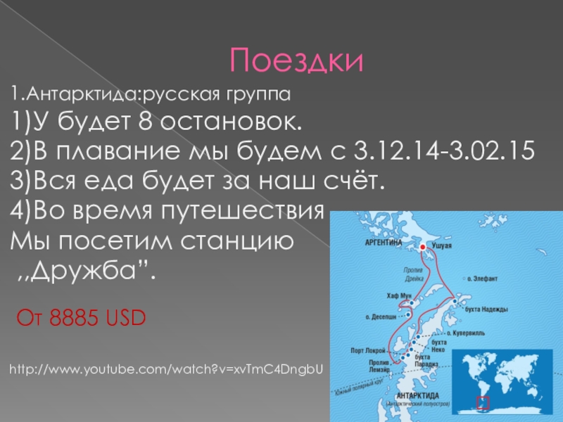 Поездки1.Антарктида:русская группа1)У будет 8 остановок.2)В плавание мы будем с 3.12.14-3.02.153)Вся еда будет за наш счёт.4)Во время путешествия